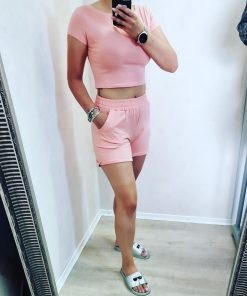 Komplet Zoja v UNI številki je sestavljen iz kratkih hlač in crop top majice z kratkimi rokavi. Na voljo v roza, marelični in črni barvi.